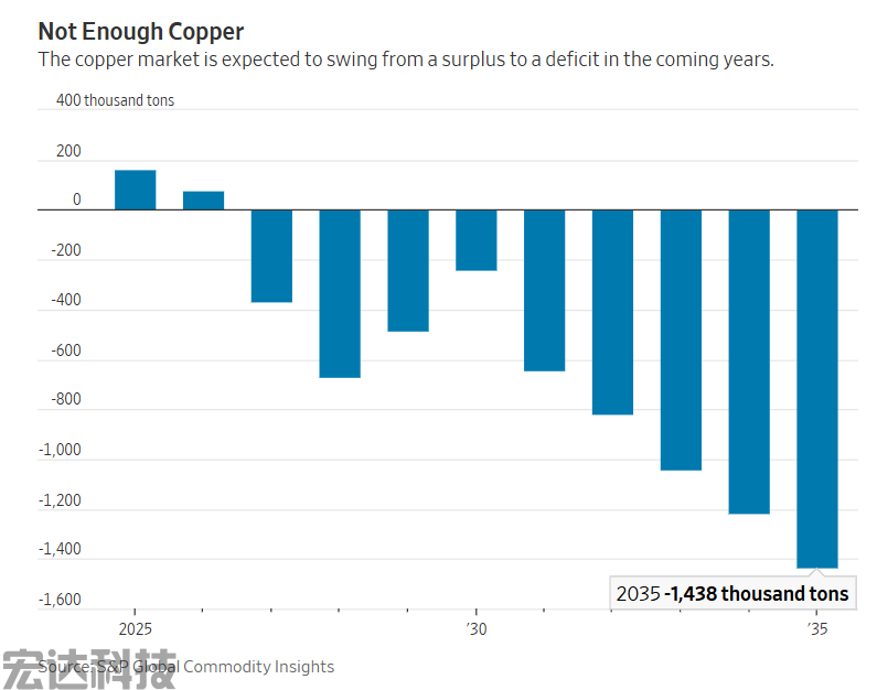 基准矿产情报公司(Benchmark Minerals Intelligence)估算,2030年电动汽车领域的铜需求将从2025年的130万吨增至230万吨;同期,发电和输电网络升级所需的铜需求将增长19%,达1490万吨。