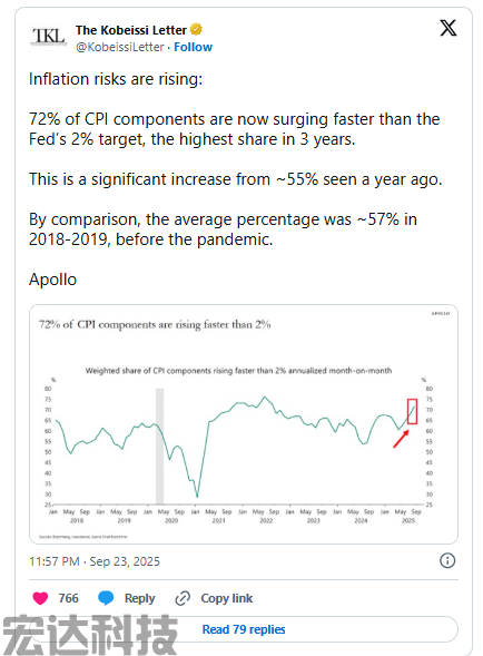 周二,The Kobeissi Letter在社交平台X上发文警示,“通胀风险正在上升”,并指出“72%的消费者价格指数(CPI)成分当前涨幅超过美联储2%的目标”,称这是三年来的最高比例。
