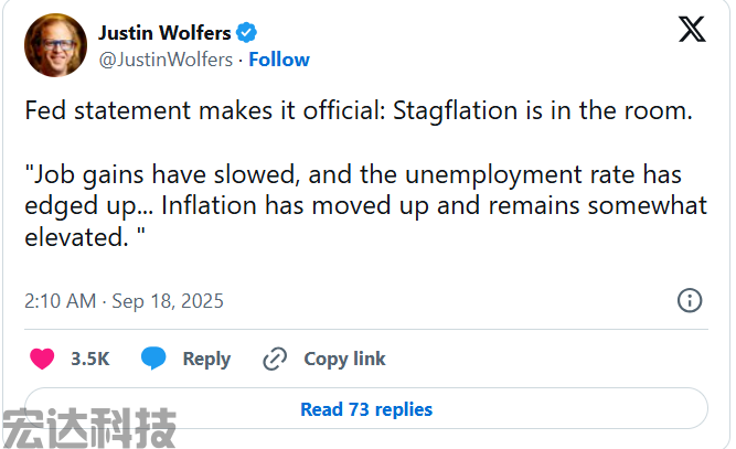 上周,沃尔弗斯称“滞胀已近在眼前”,并援引美联储主席鲍威尔的言论——鲍威尔曾表示,当前失业率持续上升,而通胀仍维持在高位。