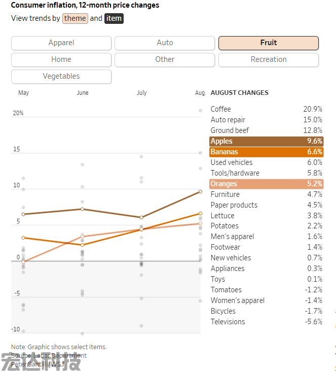 富国银行高级经济学家萨拉·豪斯(Sarah House)指出,关税成本并未一次性转嫁至消费者,但整体趋势仍指向商品价格上行。例如,8月杂货价格环比上涨0.6%,咖啡、生牛排和苹果同比涨幅分别达21%、17%和10%,直接冲击民生成本。