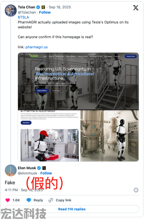 马斯克在X平台上回应了一则展示美国制药与农业基础设施公司PharmAGRI网站截图的帖子,仅写下了"假的"。