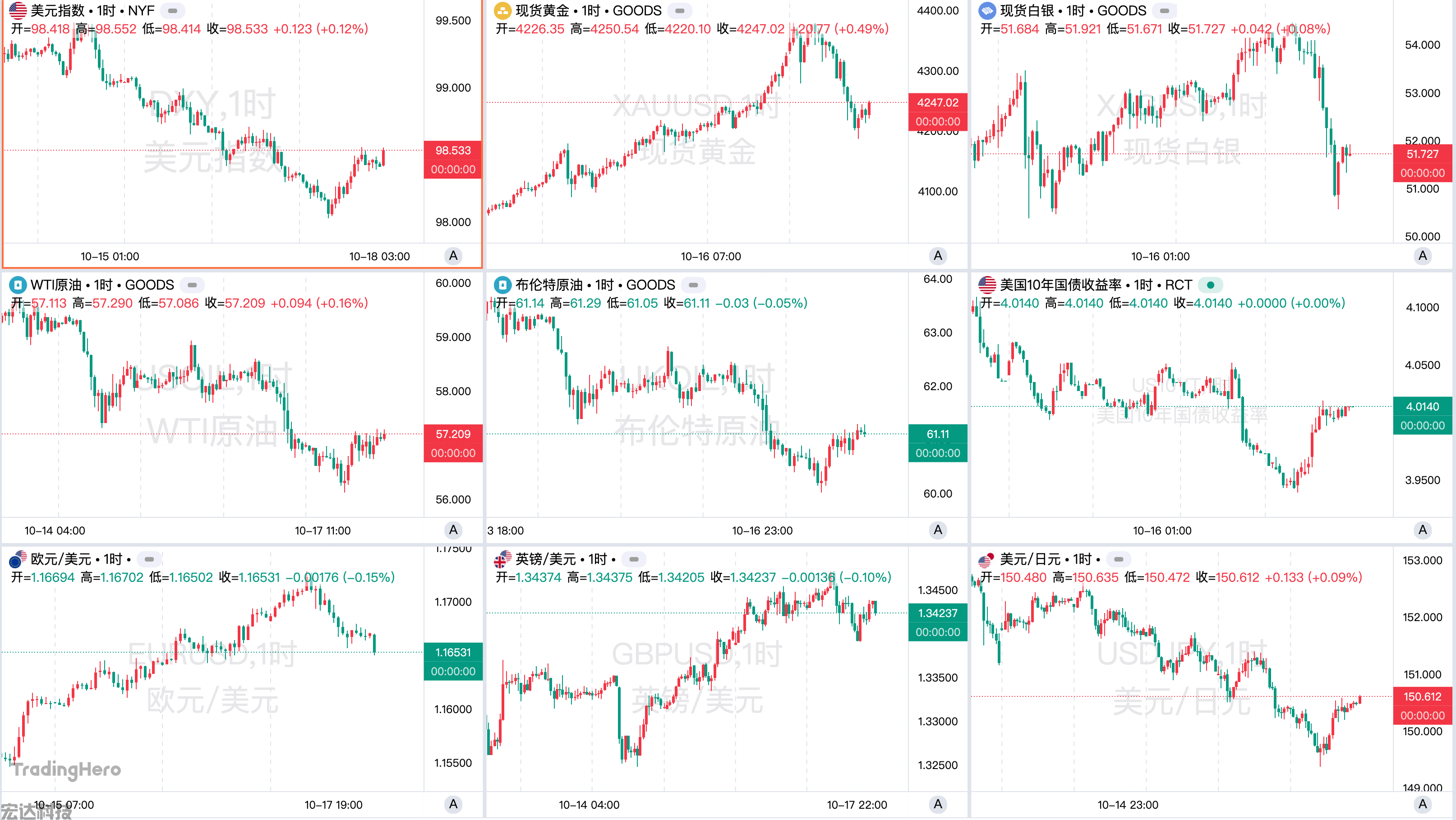 美元指数本周整体走弱,周初短暂重返99关口上方,随后连续下跌,周五收于98.53,跌0.31%。美债收益率整体走低,10年期收益率跌破4%,市场对美联储年内降息预期显著升温,避险资金流入黄金与债市。