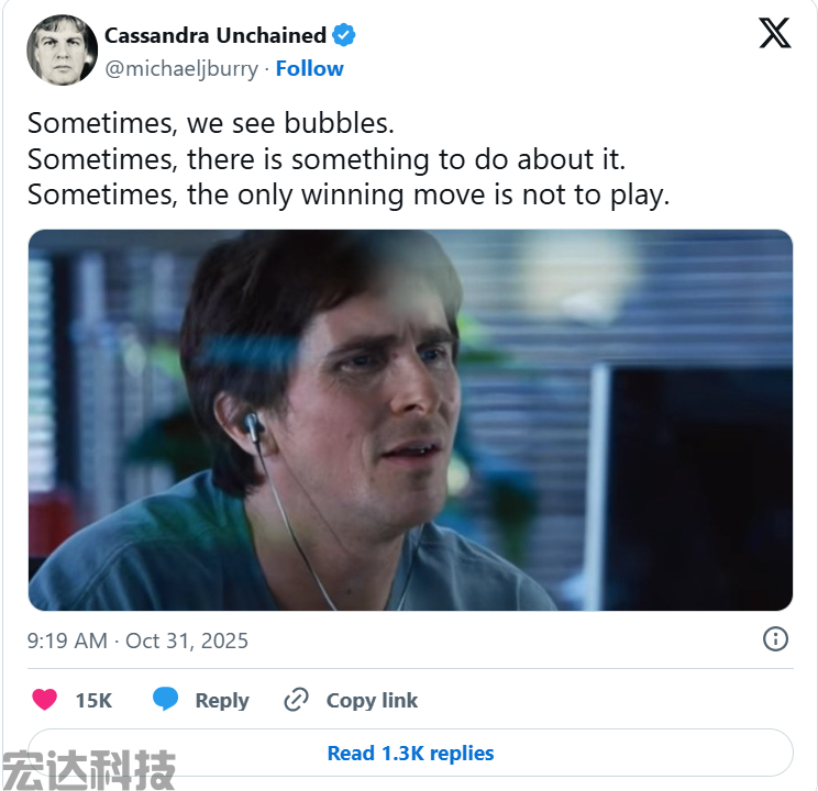 “有时,我们会看到泡沫。有时,我们能做些什么。有时,唯一的获胜策略就是不参与。”伯里在X平台发帖称,还附上了演员克里斯蒂安·贝尔(Christian Bale)在《大空头》中的剧照——贝尔在片中饰演伯里。