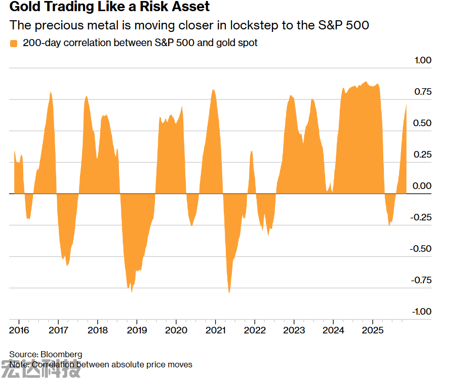 数十年来,黄金一直与股市呈反向走势,但在美元贬值担忧及各国央行对这一贵金属的旺盛需求推动下,黄金与股市的相关性已转为正向。
