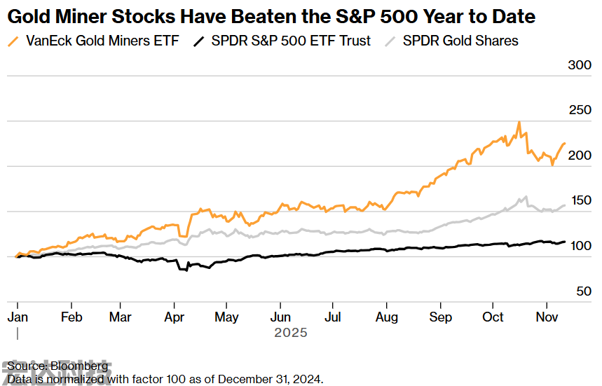 就个股而言,金矿企业纽蒙特公司(Newmont Corp.,代码NEM)、阿格尼科鹰矿业公司(Agnico Eagle Mines Ltd.,代码AEM)和巴里克黄金公司(Barrick Mining Corp.,GOLD)今年的涨幅均约为现货黄金的两倍。即便巴里克面临首席执行官离职、马里业务持续出现问题以及三季度营收不及预期等不利因素,仍未能阻挡投资者——该公司股价今年以来已上涨超130%。