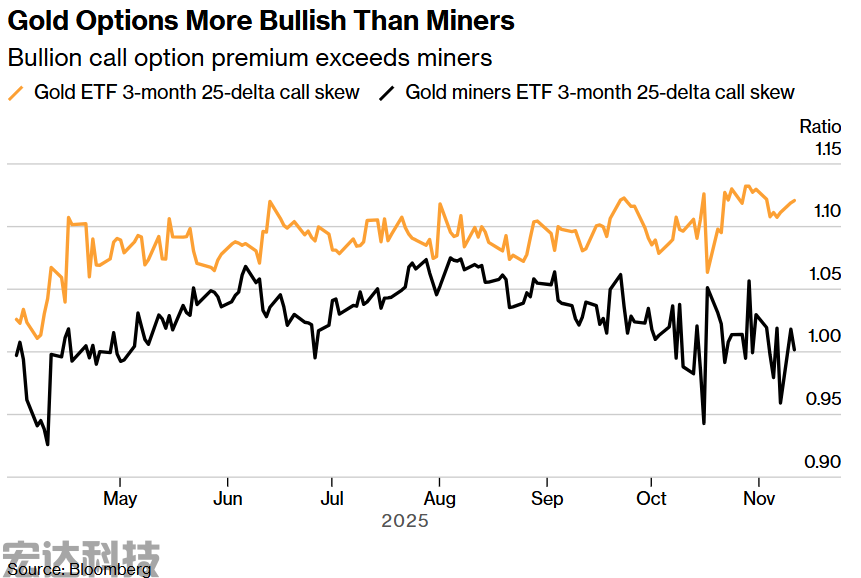 “如果你认为金价将上涨、金矿股将重拾领涨地位,而目前GDX的认购期权偏度低于2倍,那么这也是持有GDX的看涨期权或看涨期权价差以押注其持续上涨的理由。 ”他说。