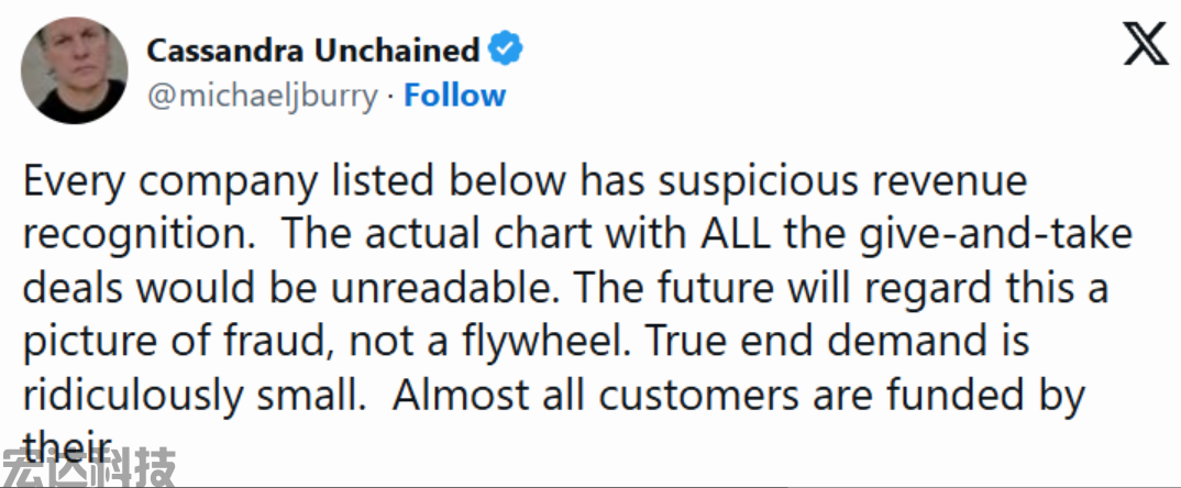 伯里认为,未来的观察者回顾这段时期时,会将当前的AI热潮视为欺诈而非变革。他认为“真实的终端需求少得可笑”,并声称许多推动AI增长的客户本身就由向他们销售AI技术的公司资助——描绘了一个自我强化的循环,而非可持续的普及应用。