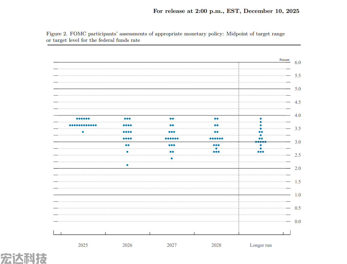 12月11日,美联储以9-3的投票比例将基准利率下调25个基点至3.50%-3.75%,为连续第三次会议降息。政策声明删除了对失业率"较低"的描述。最新点阵图维持2026年降息25个基点的预测。