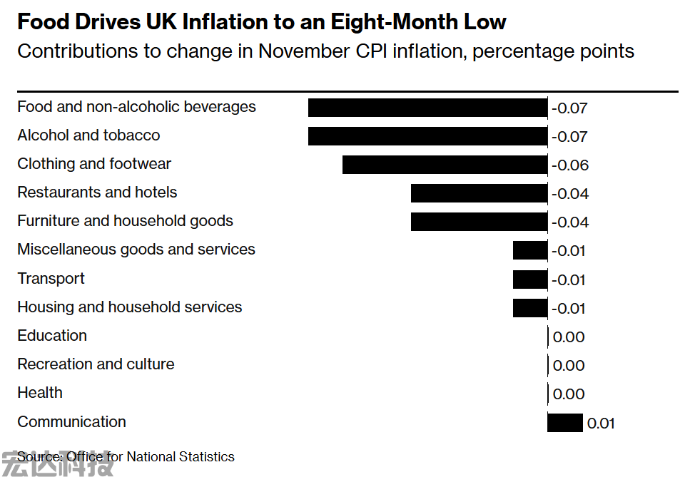 周三英国国家统计局的数据显示,各领域价格压力普遍降温,仅通信类价格呈现上行态势。食品通胀率从4.8%降至4%,烟酒价格涨幅从5.9%降至4%。受黑色星期五前后零售商大幅打折促销影响,服装和鞋类价格同比下跌0.6%。