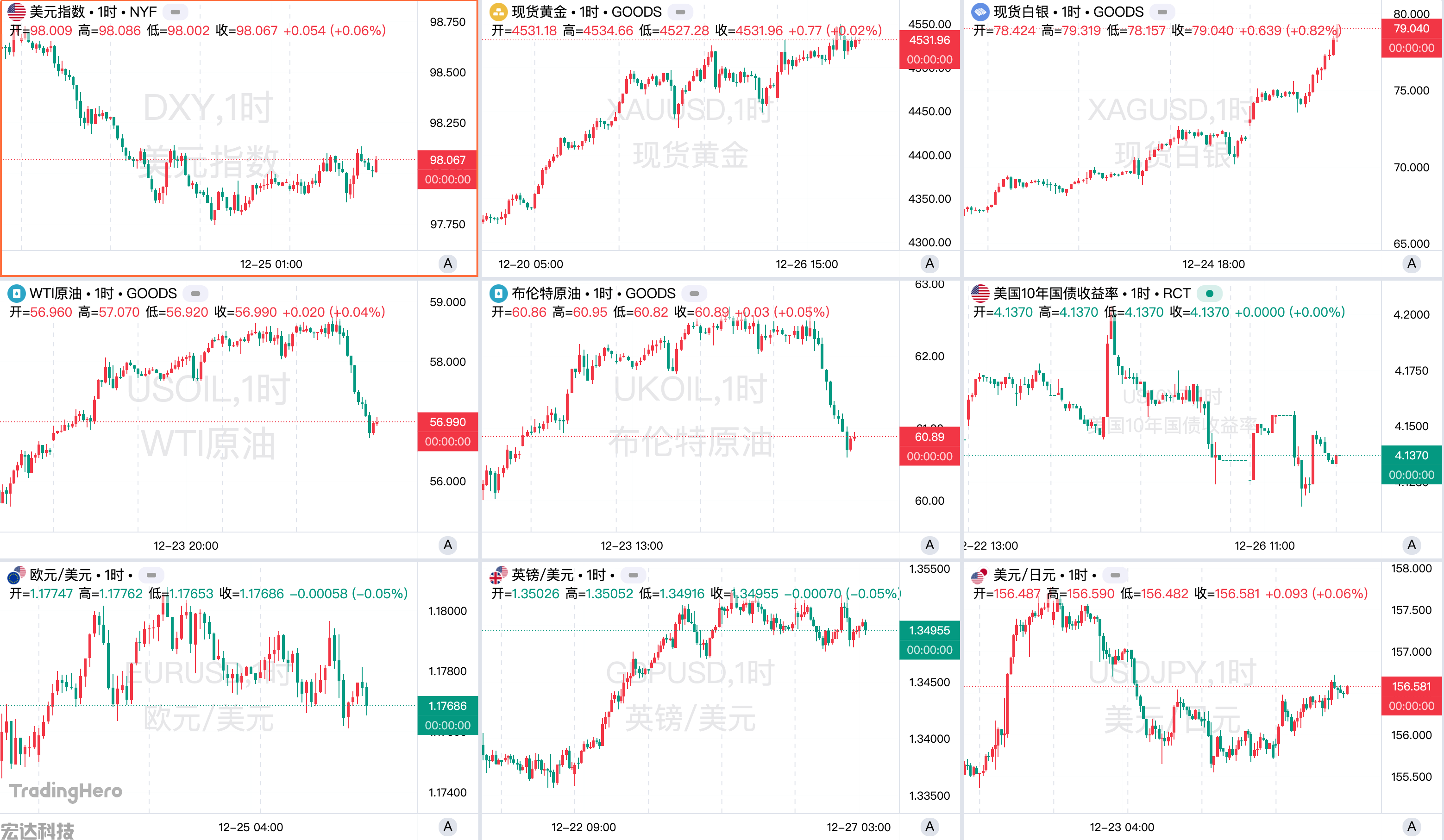 本周,美元指数整体偏弱运行,周五收于98.07,下跌0.67%。周一开盘后持续下行,周二进一步跌破98关口,反映市场对美联储明年降息预期有所升温,之后虽然出现技术性反弹,一度重回98附近,但力度有限,全周仍处相对低位震荡。