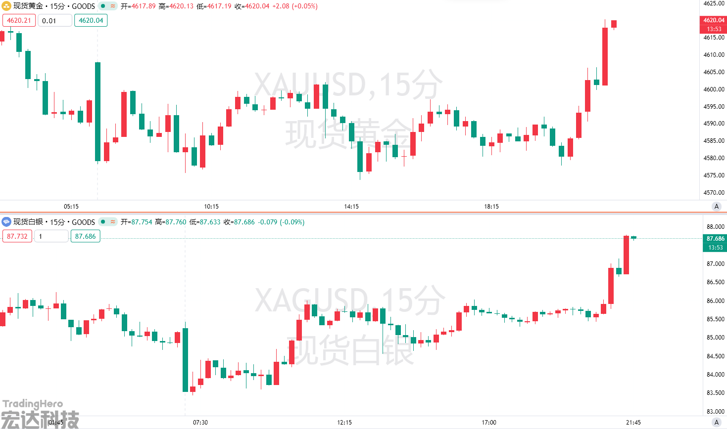 数据公布后,现货黄金短线走高超10美元,并一度站上4620美元;现货白银盘中一度大涨3%;美元指数急跌后小幅反弹。