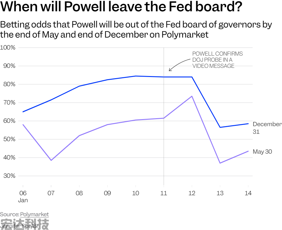 预测平台Polymarket的数据显示,在鲍威尔于1月11日发布视频回应调查后不久,关于他将在5月底以及年底前离开美联储理事会的概率均出现暴跌。