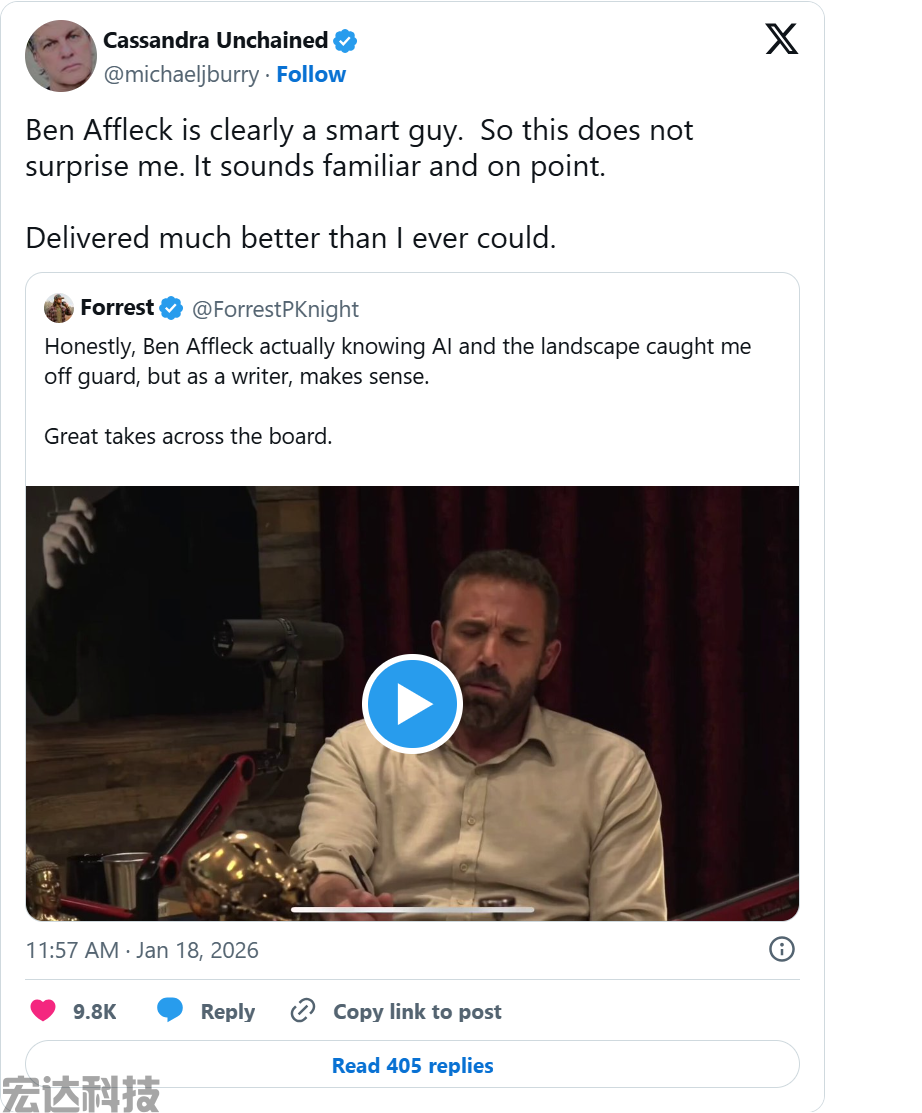 “本・阿弗莱克显然是个聪明人。”伯里于上周末在社交平台X上发文称,“所以他的这番表态并不让我意外,听起来既耳熟又切中要害。”