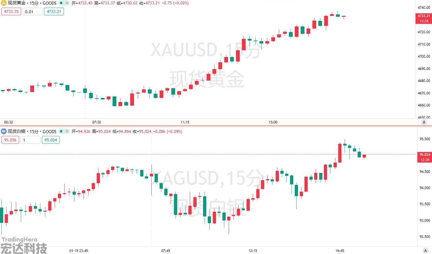 随着美国总统特朗普推动接管格陵兰岛引发了对美欧爆发潜在贸易战的担忧,周二,金价将历史新高刷新至4700美元上方,并冲上4730美元,银价也持续创下历史新高,并冲上95美元上方。