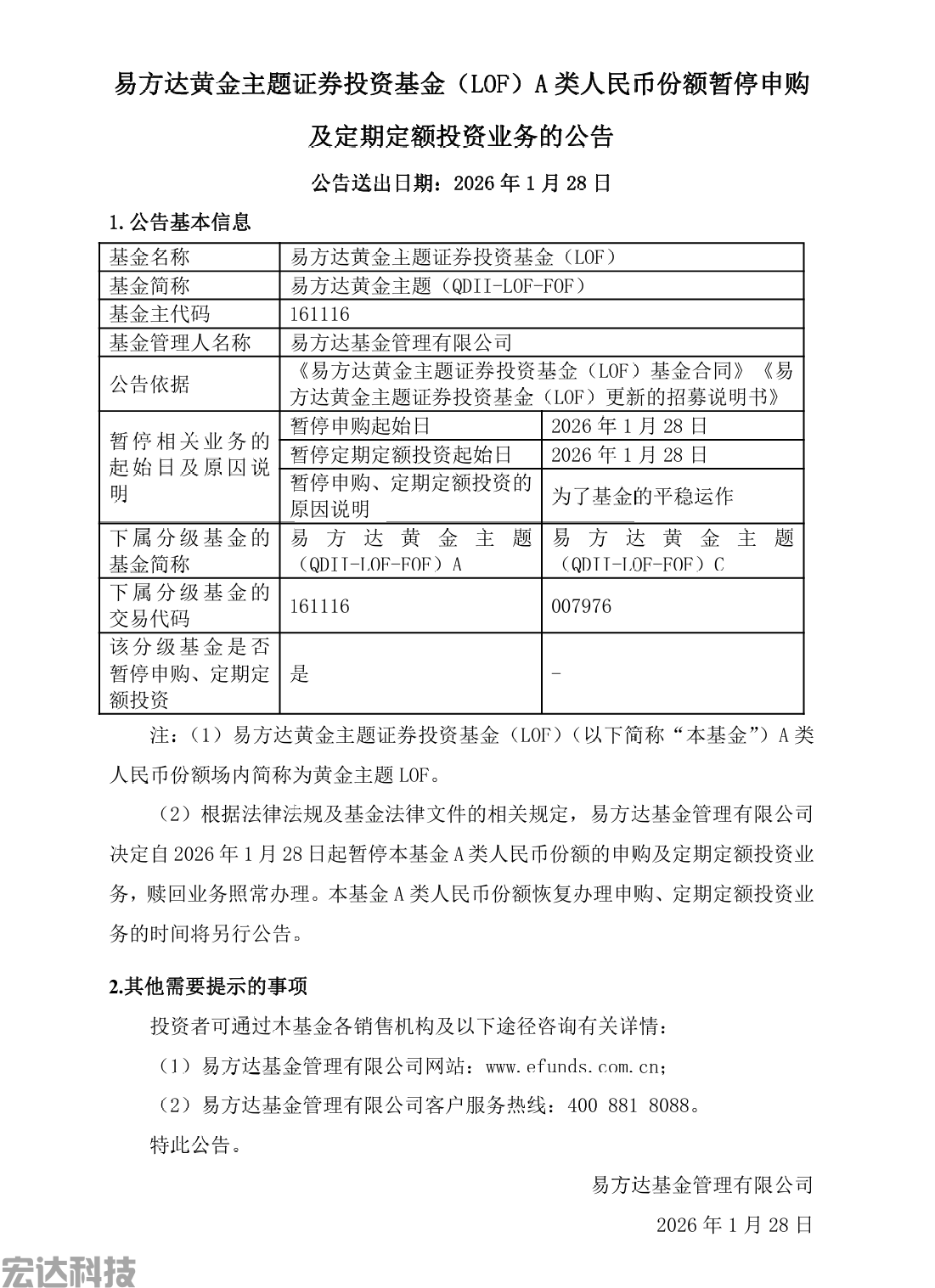 1月27日,易方达基金公告显示,易方达黄金主题证券投资基金(LOF)自2026年1月28日起暂停A类人民币份额申购及定期定额投资业务,赎回业务照常办理,恢复时间将另行公告。