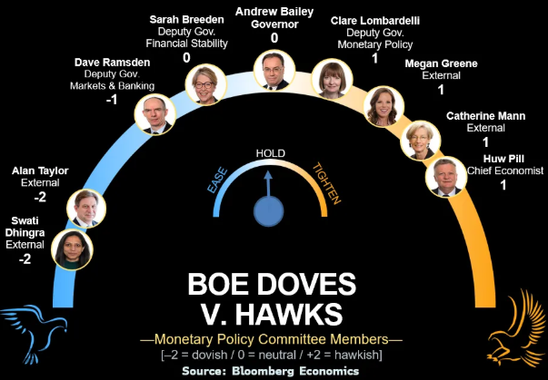 预计英国央行不会修改这一新指引,这反映出政策目前已接近中性,因此委员会需要更加谨慎地行事。鹰派成员,如外部成员格林和首席经济学家皮尔,仍然担心高企的通胀预期。反之,丁格拉和泰勒则受到劳动力市场疲软的影响。