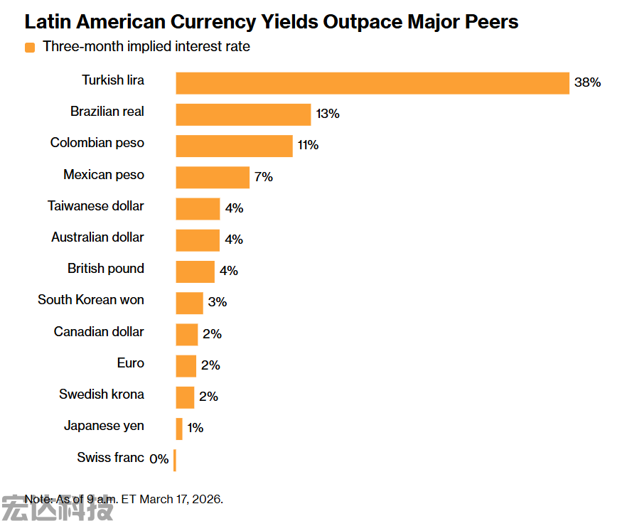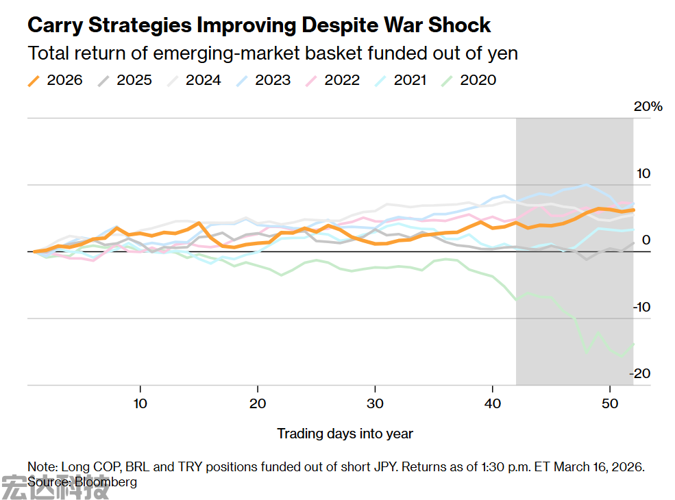 据彭博汇编数据显示,一种流行的做法是借入日元,买入一篮子货币,其中包括巴西雷亚尔、哥伦比亚比索和土耳其里拉。自美以发动对伊朗的袭击开始以来,该策略已获得超过2%的回报,今年以来回报率超过6%,为2023年以来最强开局。