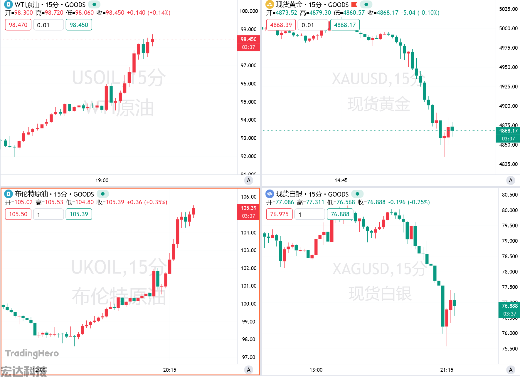 布伦特原油突破105美元/桶,日内涨超4.5%。WTI原油站上98美元/桶,日内涨超3%。欧洲TTF天然气价格上涨6.7%,至每兆瓦时55.02欧元。由于能源价格飙升引发通胀担忧,进而削弱美联储降息预期,贵金属盘中持续下挫。现货黄金一度跌逾3%,最低触及4834.42美元/盎司,创一个多月来的最低水平;现货白银一度跌逾4%,同样创一个月来新低。