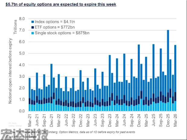 大约有名义价值高达5.7万亿美元、与美国个股、指数和交易所交易基金(ETF)挂钩的期权将于周五到期。这个被交易员们戏称为“三巫日”的季度性事件,创下了花旗自1996年有数据记录以来的3月最大规模交割。这5.7万亿美元中,包括了4.1万亿美元的指数合约、7720亿美元的ETF期权以及8750亿美元的个股期权。