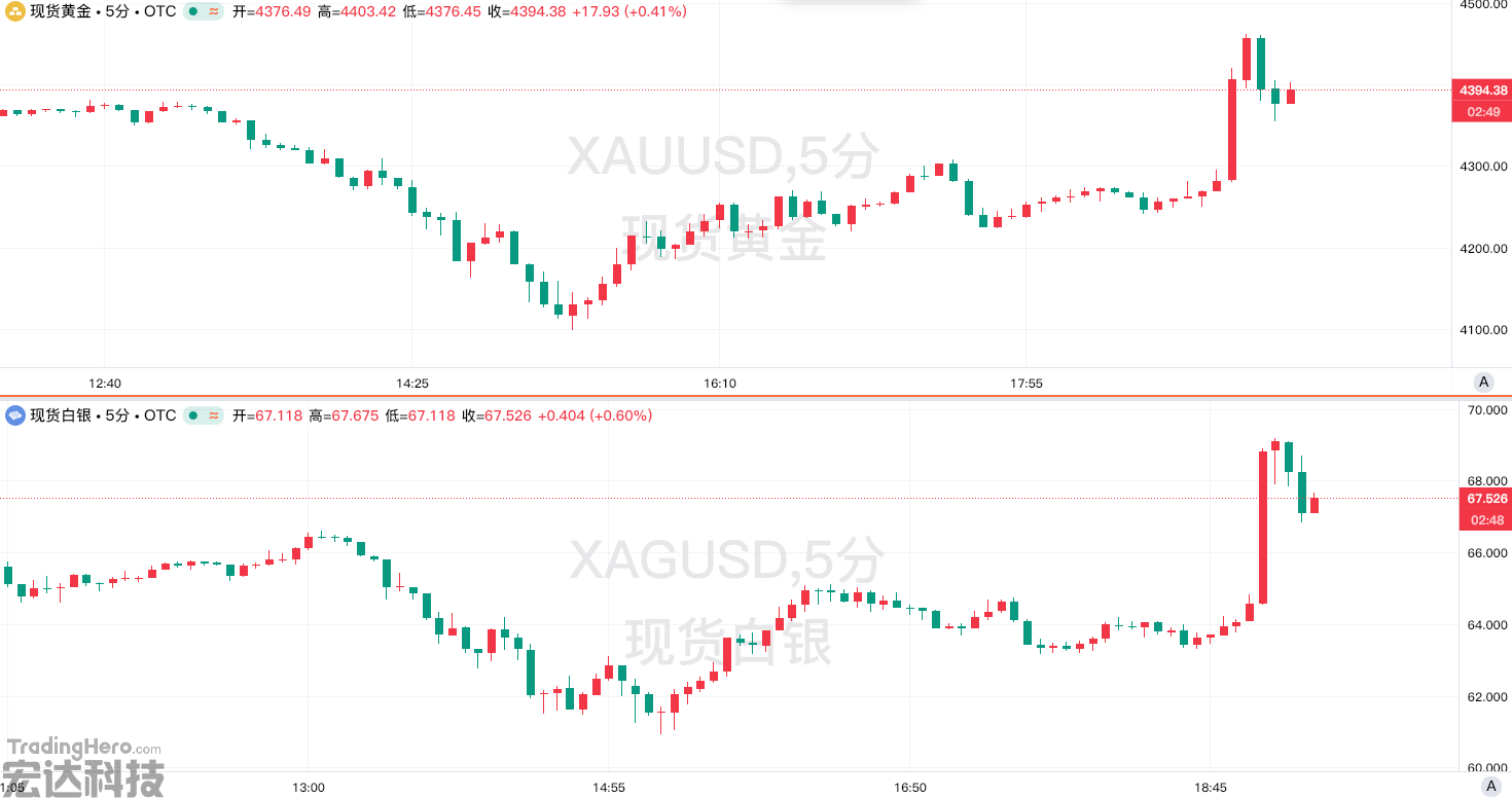 特朗普公布此番言论后,现货黄金短线上扬超100美元,一度重回4400美元;现货白银一度重回69美元上方;美、布两油直线一度暴跌超10%;美元指数日内走低约100点;欧股纷纷转涨。