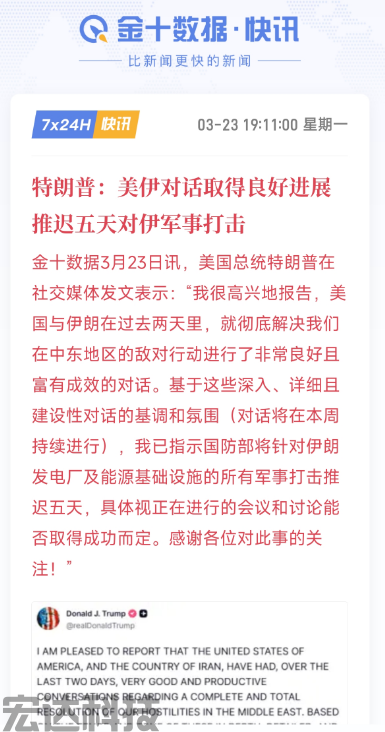 "我很高兴地报告,美国与伊朗在过去两天里,就彻底解决我们在中东地区的敌对行动进行了非常良好且富有成效的对话。基于这些深入、详细且建设性对话的基调和氛围(对话将在本周持续进行),我已指示国防部将针对伊朗发电厂及能源基础设施的所有军事打击推迟五天,具体视正在进行的会议和讨论能否取得成功而定。感谢各位对此事的关注!"