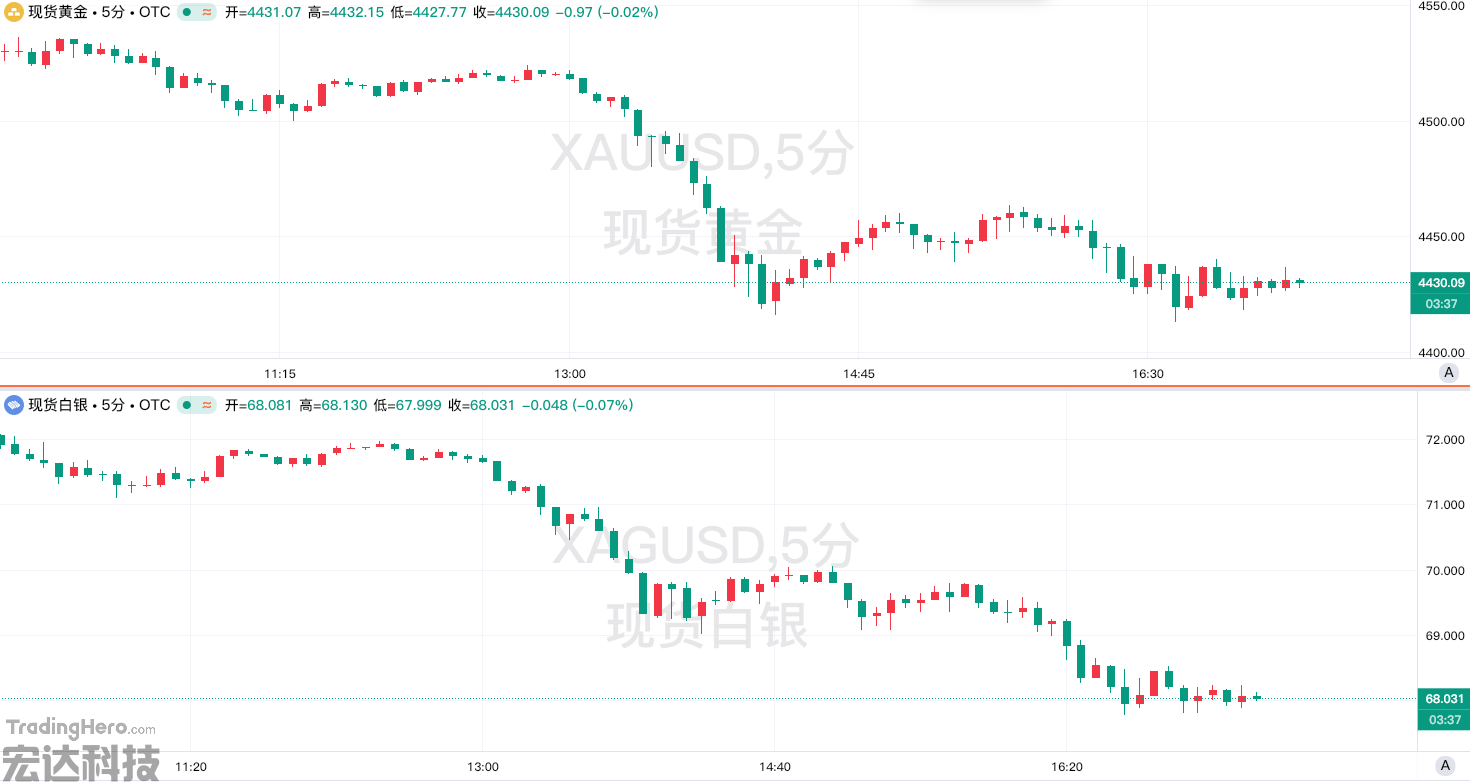 截至周四美盘前,现货黄金日内跌近2%,现徘徊在4430美元附近;现货白银日内大跌超4%,并一度跌破68美元。