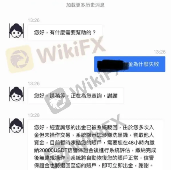 一听到自己账户涉嫌“洗钱”,该投资者慌了,自己啥也没干就被指控“洗钱”,情急之下就缴纳了平台所谓的保证金。就当该投资者以为没事了,进行第三次申请出金时,又遭到了平台拒绝。这个时候该投资者再去问,该平台客服还是以投资者多次入金没有交易,涉嫌洗钱为由,向投资者索取2万美金信誉保证金。