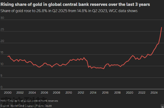 随着过去一个月的指数级涨幅,新兴市场央行不需要做太多事情就能继续推进它们的共同目标,增加黄金在外汇储备中的份额以实现多元化。