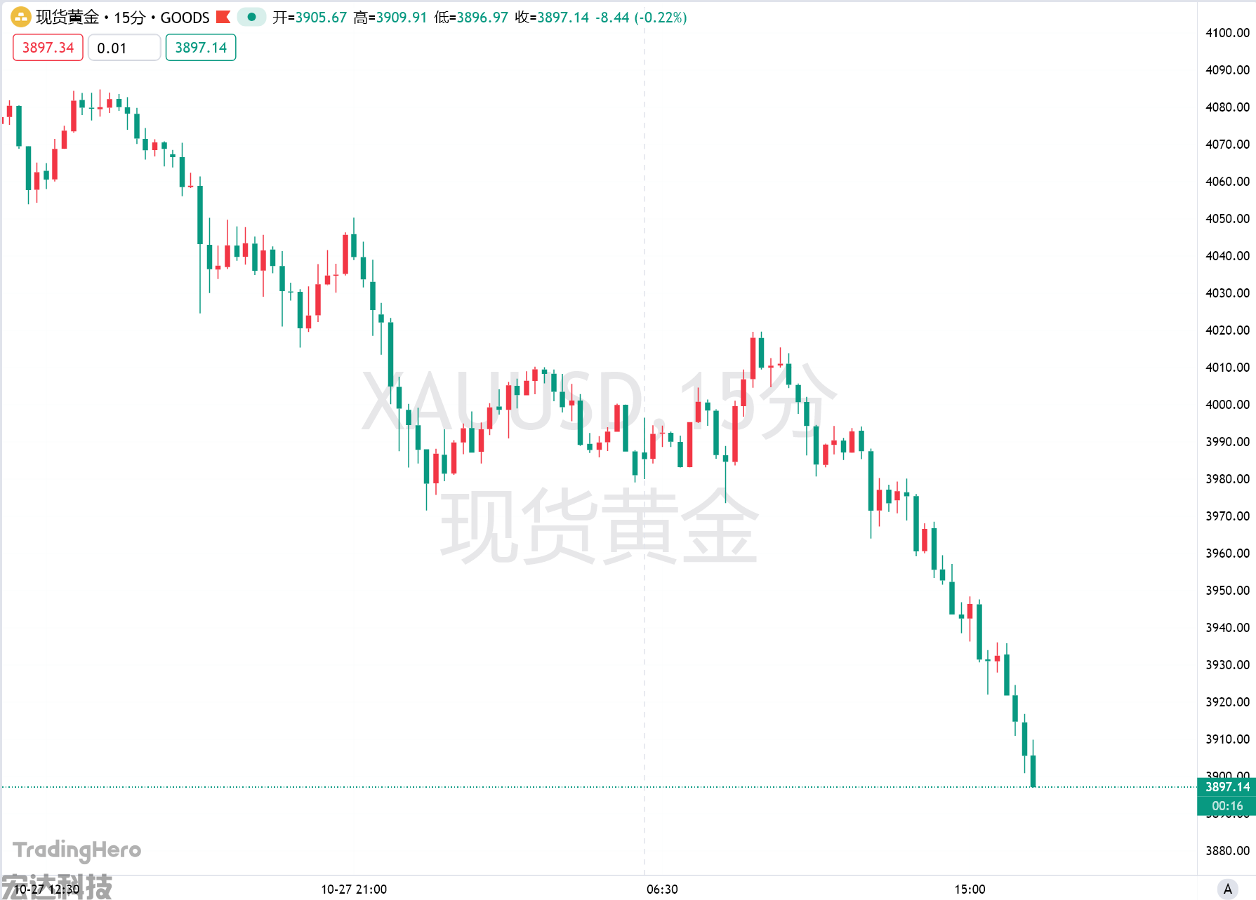由于贸易紧张局势缓解持续抑制避险需求,现货黄金周二延续跌势,下破3900美元/盎司整数关口,较日高跌超120美元,日内跌幅超过2%,两日来连续失守4000、3900美元/盎司两道大关。