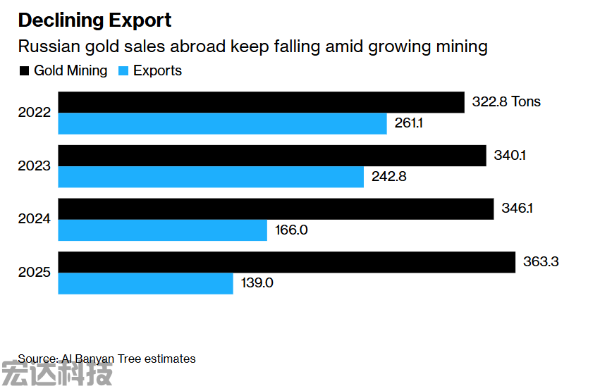 2025年10月,俄罗斯在圣彼得堡交易所启动实物黄金交易,试图替代LBMA定价基准,但目前仅成交少量金条。Al Banyan Tree同时指出,俄罗斯黄金出口规模已出现下滑。