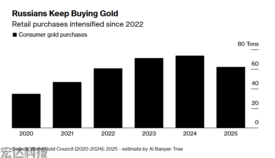 总部位于香港的量化研究初创企业Al Banyan Tree Research指出,2025年俄罗斯零售市场的金条、金币及黄金首饰购买量预计将达62.2吨(约合200万盎司)。该机构由具备俄罗斯大宗商品行业经验的金融分析师与风险经理创立。