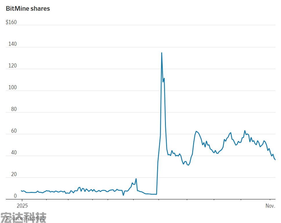 BitMine Immersion Technologies是一家大型以太坊财库公司,得到蒂尔支持,由华尔街资深策略师汤姆·李(Tom Lee)运营,该公司股价过去一个月下跌逾30%。