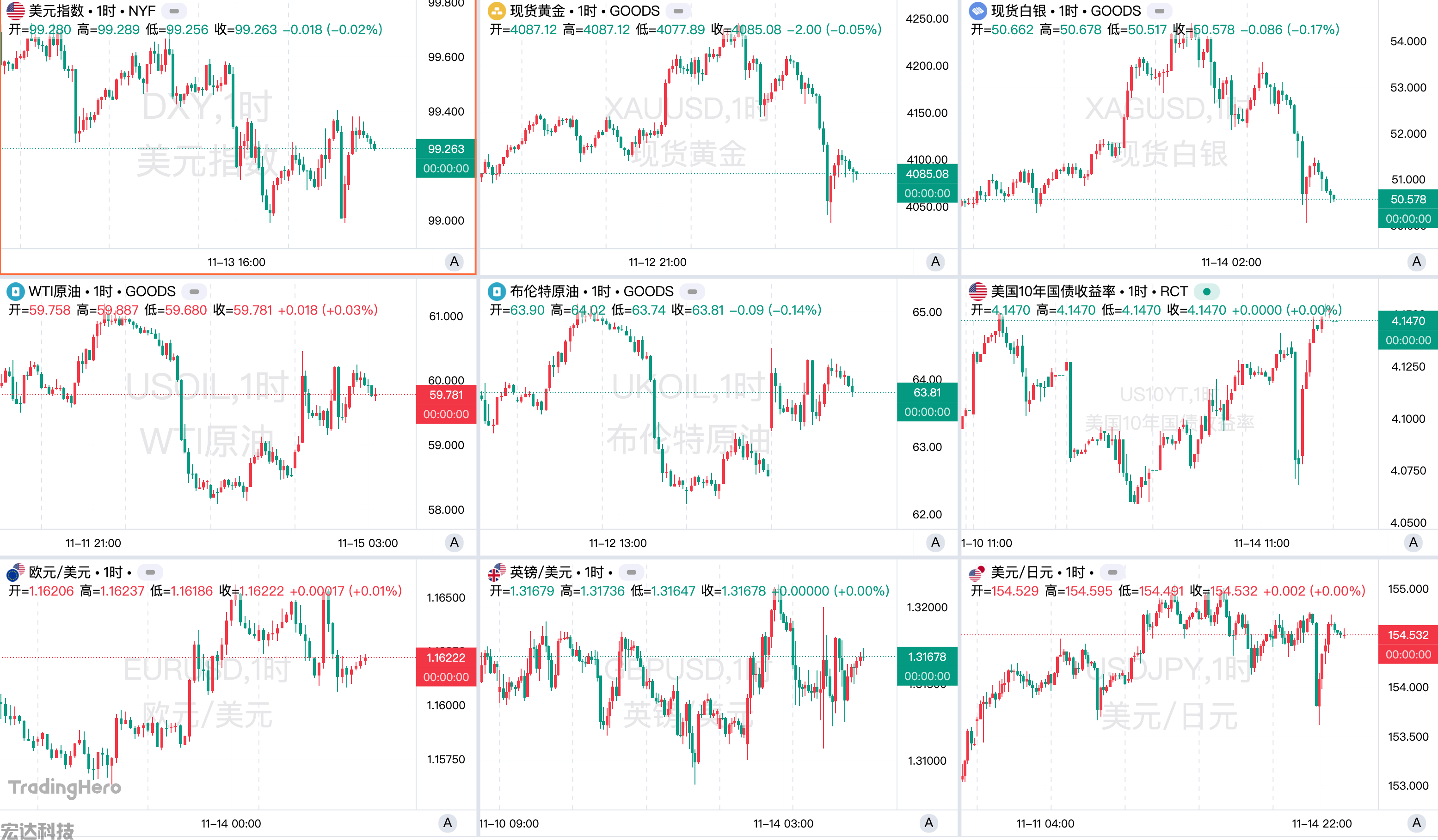 美元指数本周整体略微承压,一度跌破99关口,周五收于99.26,连续第二周收跌。美国政府最长停摆结束,关键经济数据仍需时间才能陆续公布。美联储官员陆续释放鹰派信号,12月降息概率下降。