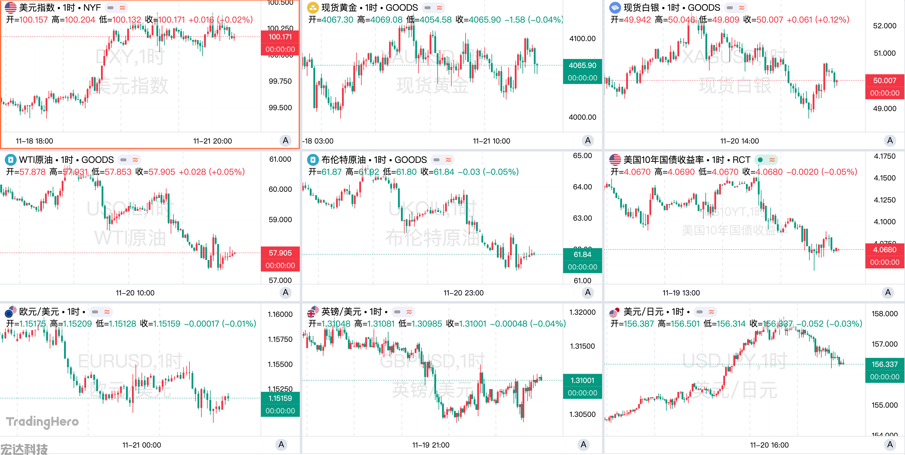 美元指数本周整体走强,四天连涨、一度上破100关口并创近两周新高,周五收于100.17,周内涨0.91%。驱动因素主要是美联储12月降息预期降温、避险情绪升温以及就业数据喜忧参半带来的政策不确定性。
