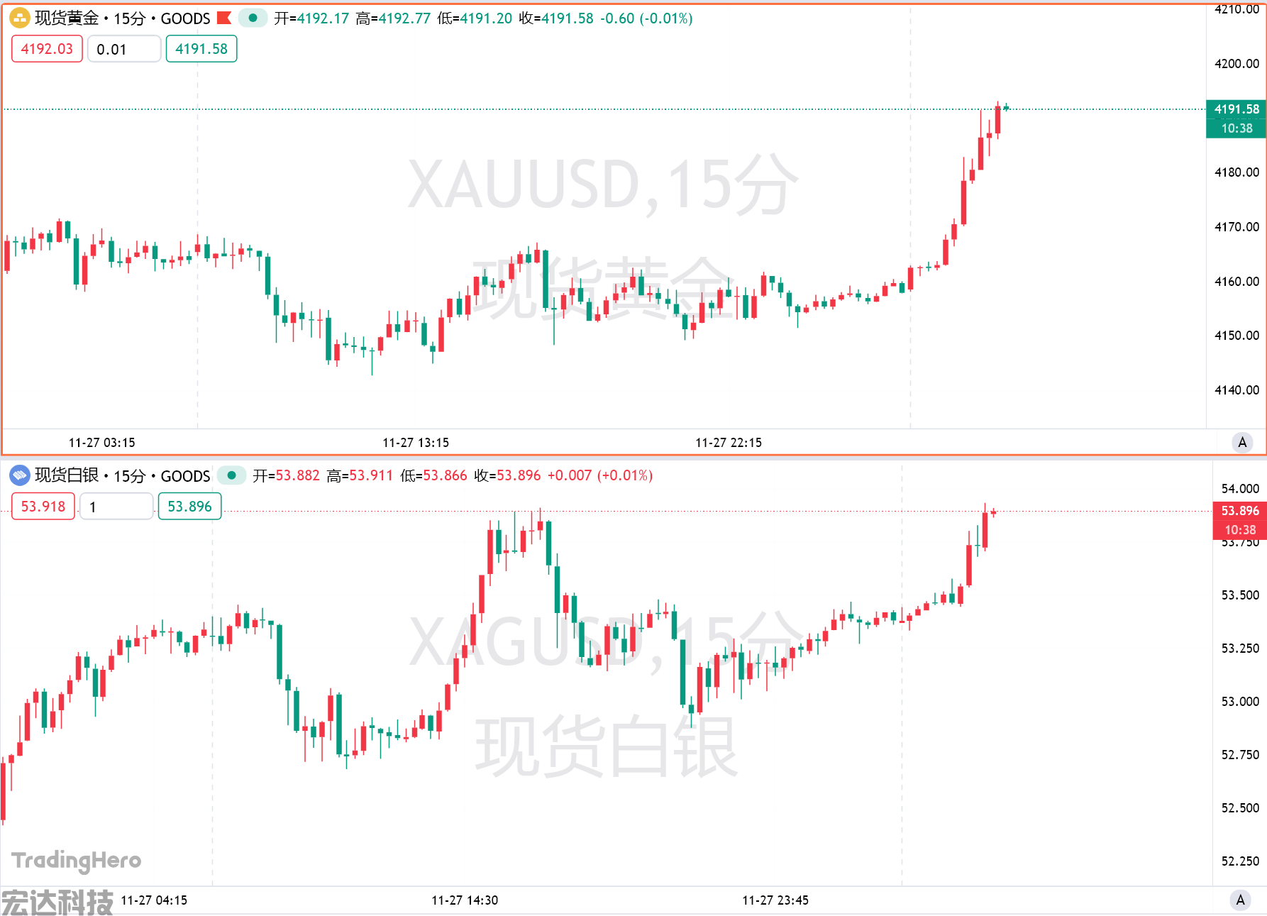周五亚盘,受美联储12月降息预期提振,国际现货黄金走高,一度向上触及4190美元/盎司。现货白银日内涨超1%,逼近54美元/盎司。美国市场因感恩节休市,假期交投清淡通常会放大短期价格波动。