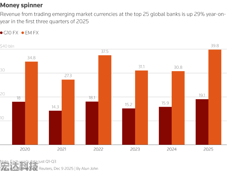 Vali Analytics为路透社整理的数据显示,新兴市场货币交易已成为银行的盈利利器。今年前九个月,全球前25大银行通过此类交易斩获近400亿美元收入,创下历史最佳业绩。该数据公司的分析还显示,这一收入规模是这些银行从十国集团货币交易中获利的两倍多,十国集团货币涵盖美元、英镑、欧元等主要币种。