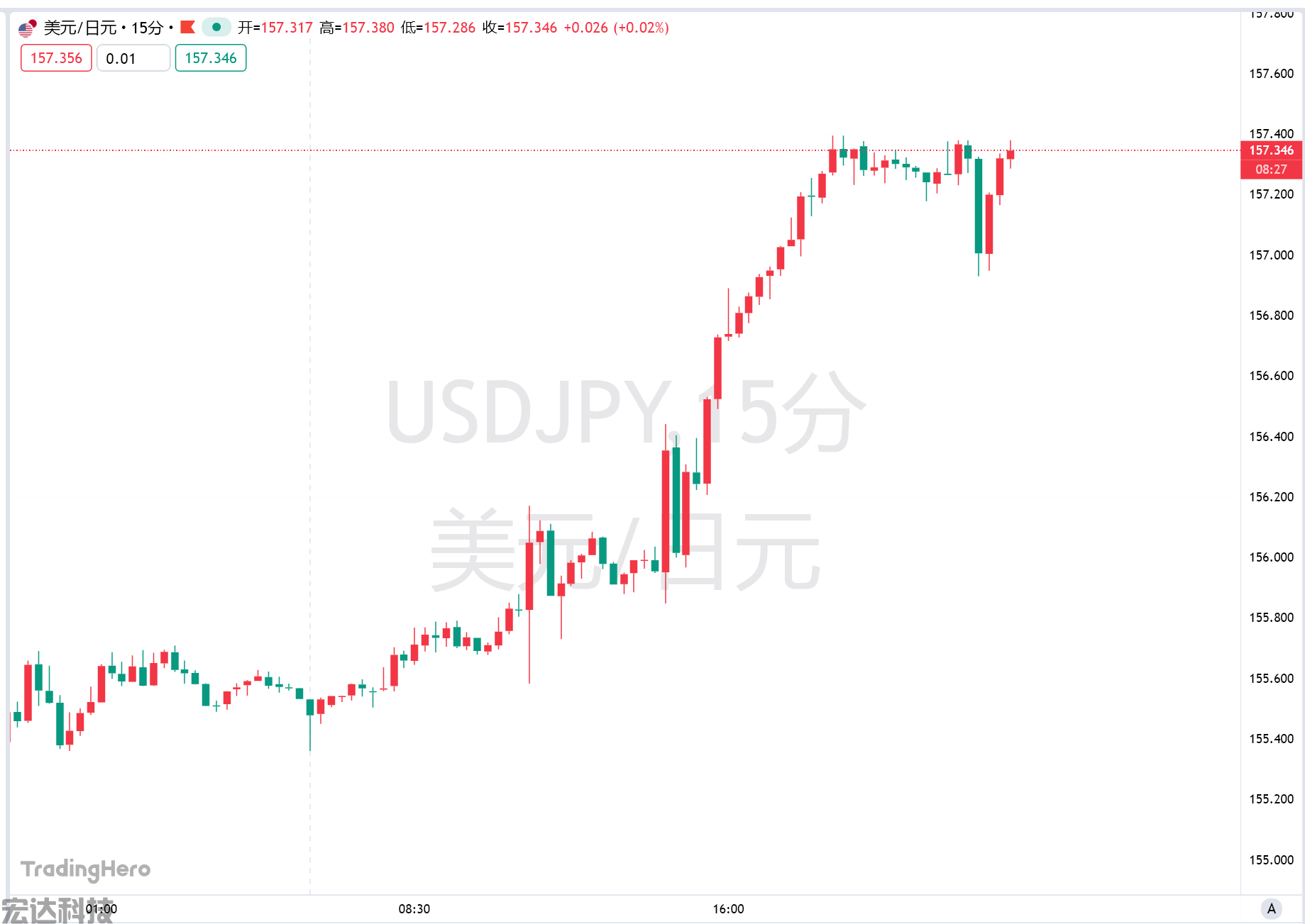 美元兑日元在157关口上方持续走高,有望创下10月初以来的最大单日涨幅,同时也是近1个月来的最高水平。欧元兑日元触及纪录新高,日内上涨1.2%。