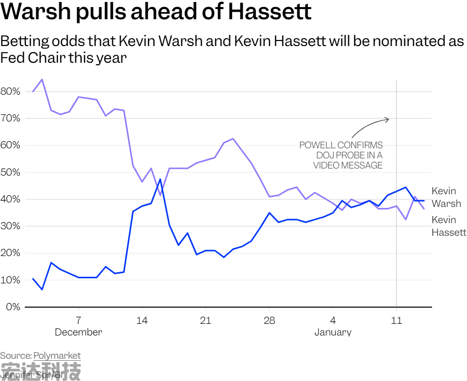 预测市场同时也调整了对特朗普盟友凯文・哈塞特(Kevin Hassett)获提名接任美联储主席的概率预期。在美国司法部调查消息传开前后,美联储主席候选人名单中立场更为鹰派的凯文・沃什(Kevin Warsh),在Polymarket平台的支持率开始反超哈塞特。