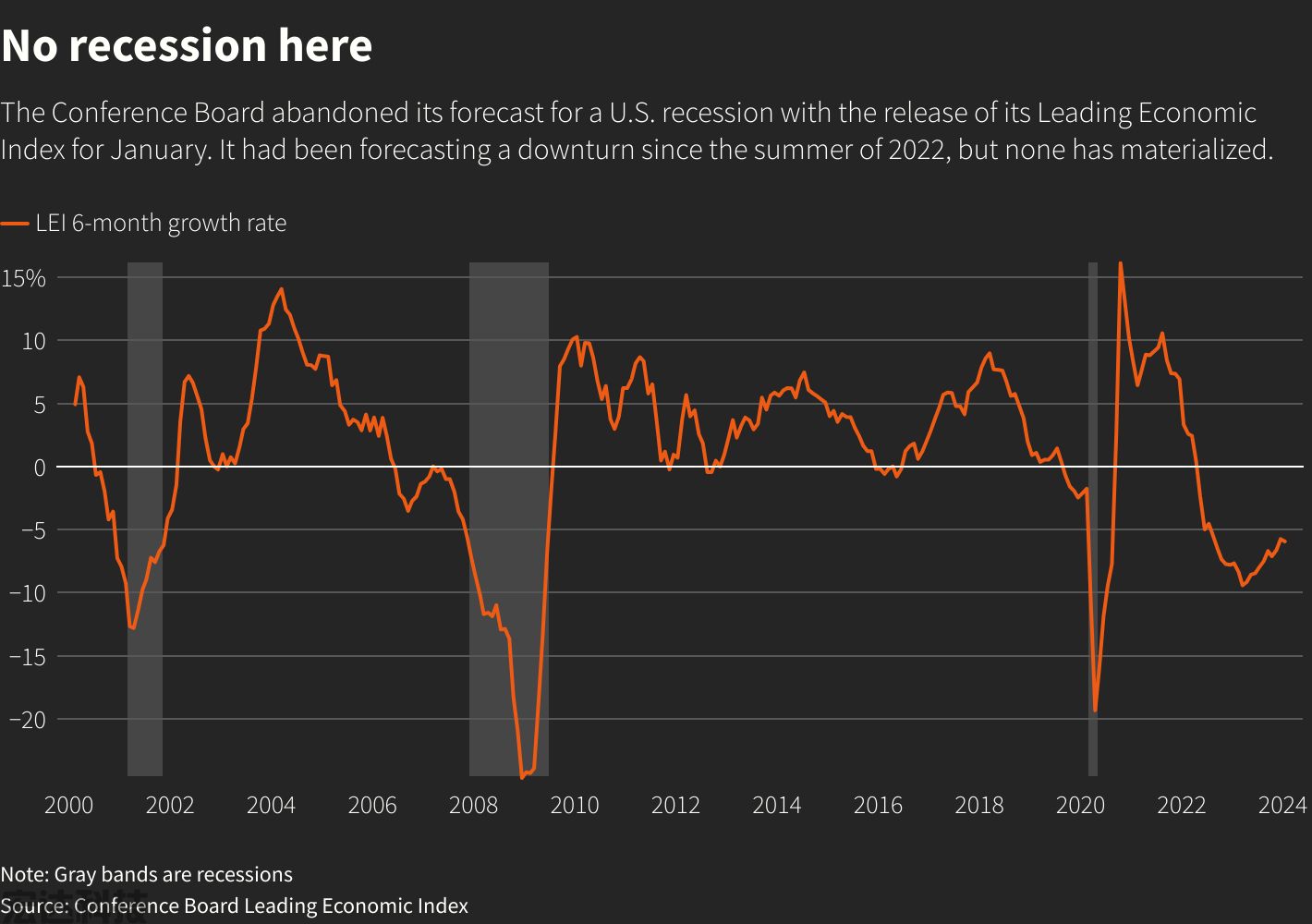 世界大型企业联合会于2022年7月首次宣布LEI预示经济衰退即将到来。尽管美国经济产出、就业增长和消费者支出自始至终都持续高于趋势水平,并且没有出现经济衰退,但直到周二发布的1月份报告之前,它都在每个月的报告中重复了这一预测。