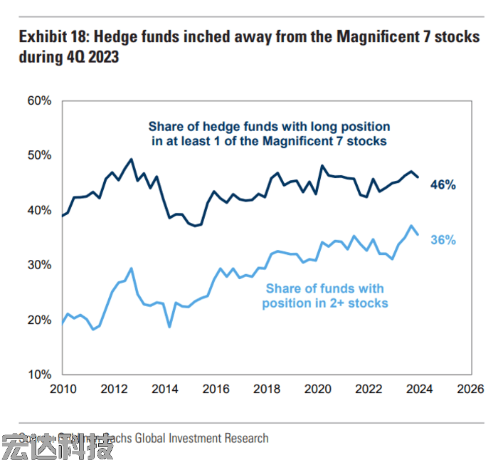 在"七巨头"中,受欢迎的科技巨头占对冲基金总多头投资组合的13%,除特斯拉外,所有这些公司都在对冲基金最受欢迎的10只股票之列。