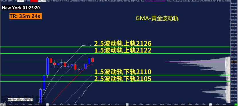 60分钟GMA-黄金波动轨指标关键点位2105、2110、2122、2126,可以关注这些位置附近的波动轨变化。黄金波动轨是依据波动率计算测算出来的,在震荡行情用法为触轨即可能反转!重点关注1.5倍波动轨和2.5倍波动轨位置。