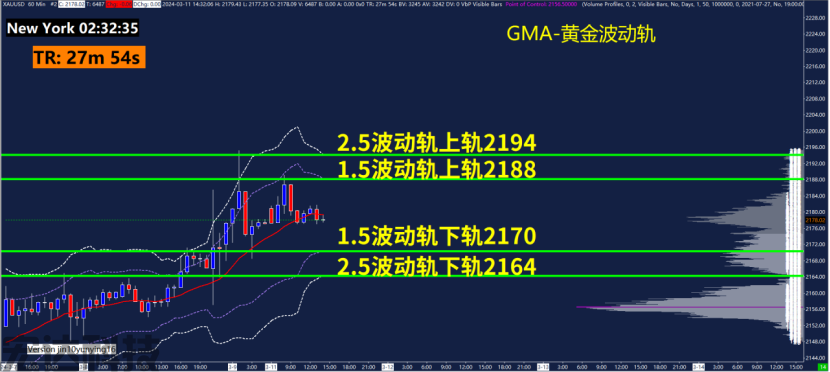 60分钟GMA-黄金波动轨指标关键点位2164、2170、2188、2194,可以关注这些位置附近的波动轨变化。黄金波动轨是依据波动率计算测算出来的,在震荡行情用法为触轨即可能反转!重点关注1.5倍波动轨和2.5倍波动轨位置。