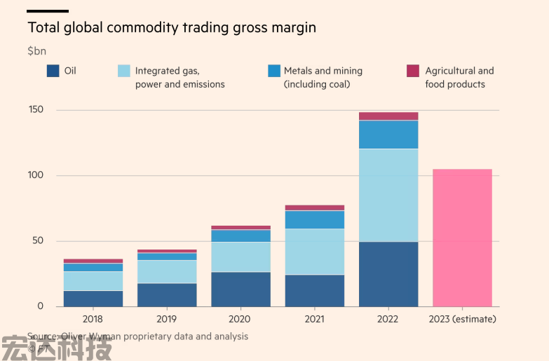 相比之下,大宗商品行业在疫情前(2018年)的毛利润大约为360亿美元,但在疫情和俄乌冲突连番冲击之后的2022年,行业利润达到创纪录的1480美元。