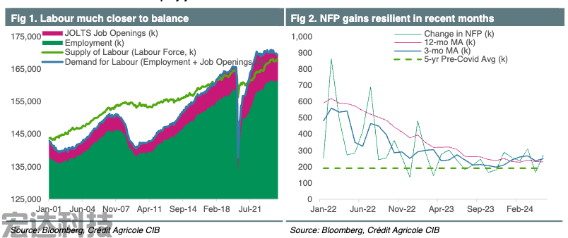 法国农业信贷银行继续预计,就业市场未来会逐步降温,失业率将逐渐升至2025年中期的4.5%左右。也就是说,贝弗里奇曲线的形状表明,进一步的就业降温可能会导致更多裁员,而不是仅仅通过减少职位空缺来实现,这可能会导致失业率更快上升。此前美联储主席鲍威尔称失业率将维持在4%,而且认为这仍是很低的水平。