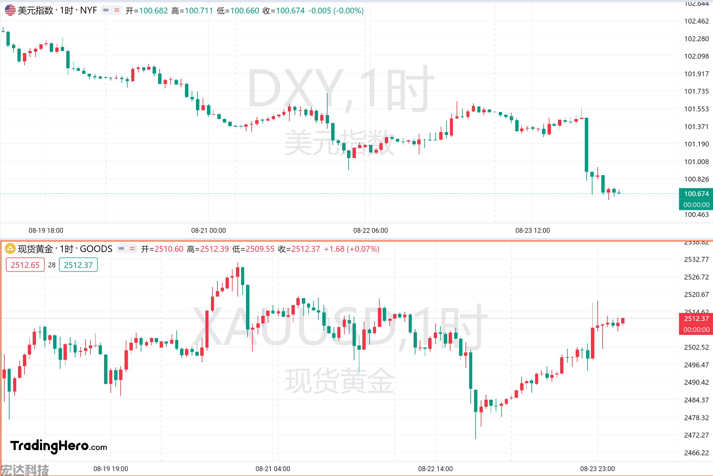 美元指数本周整体走势低迷。截至周三,美指连续四个交易日走低,盘中一度下破101关口,创年内新低。周四,美指脱离年内低位,在美国PMI和成屋销售数据公布后扩大涨势。周五,市场将鲍威尔言论视为"迄今最强烈降息信号",美指再度失守101,并收于此处下方。